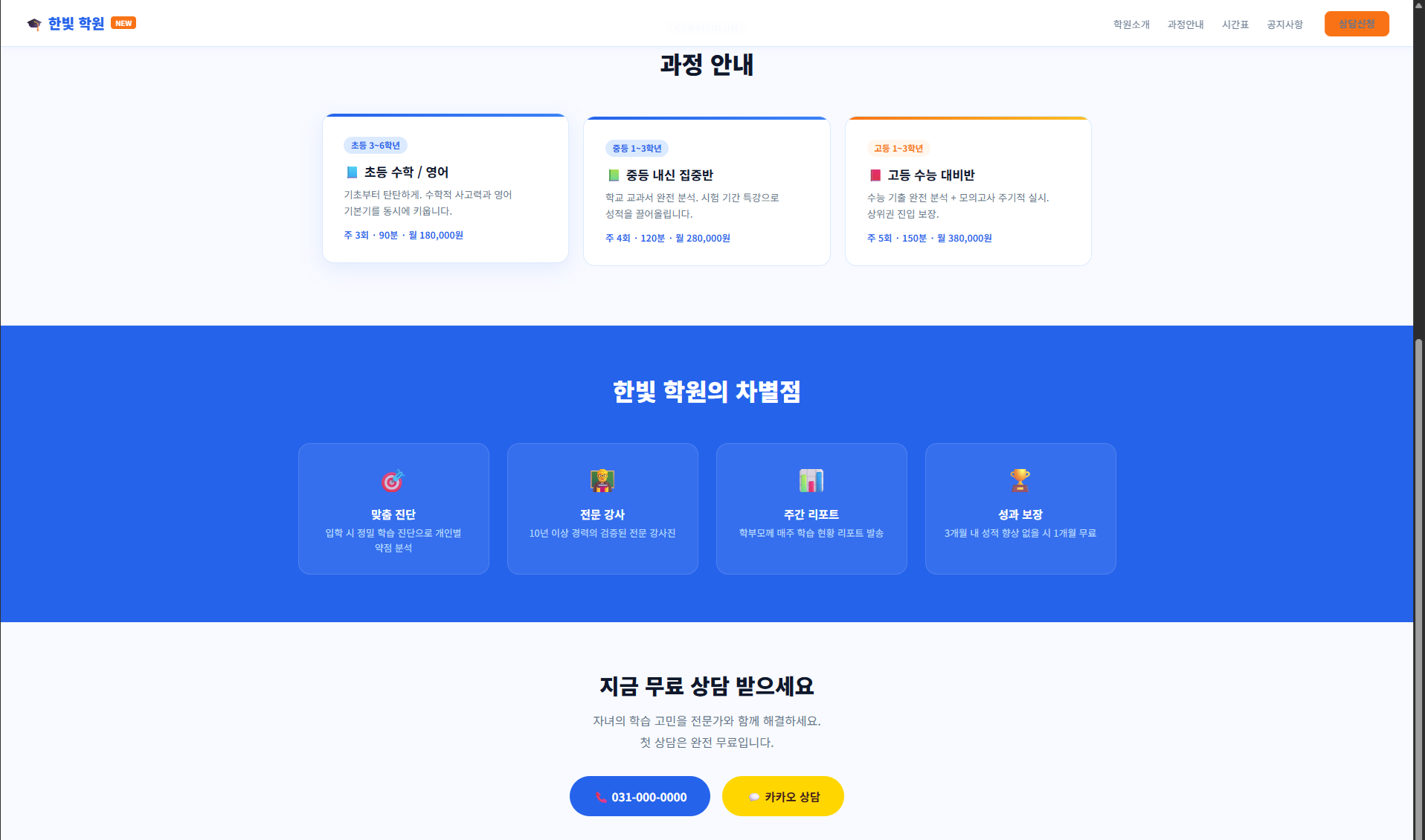 샘플 보기 →신뢰감 있는 블루+오렌지 계열. 과정안내·통계·상담 신청 포함.
