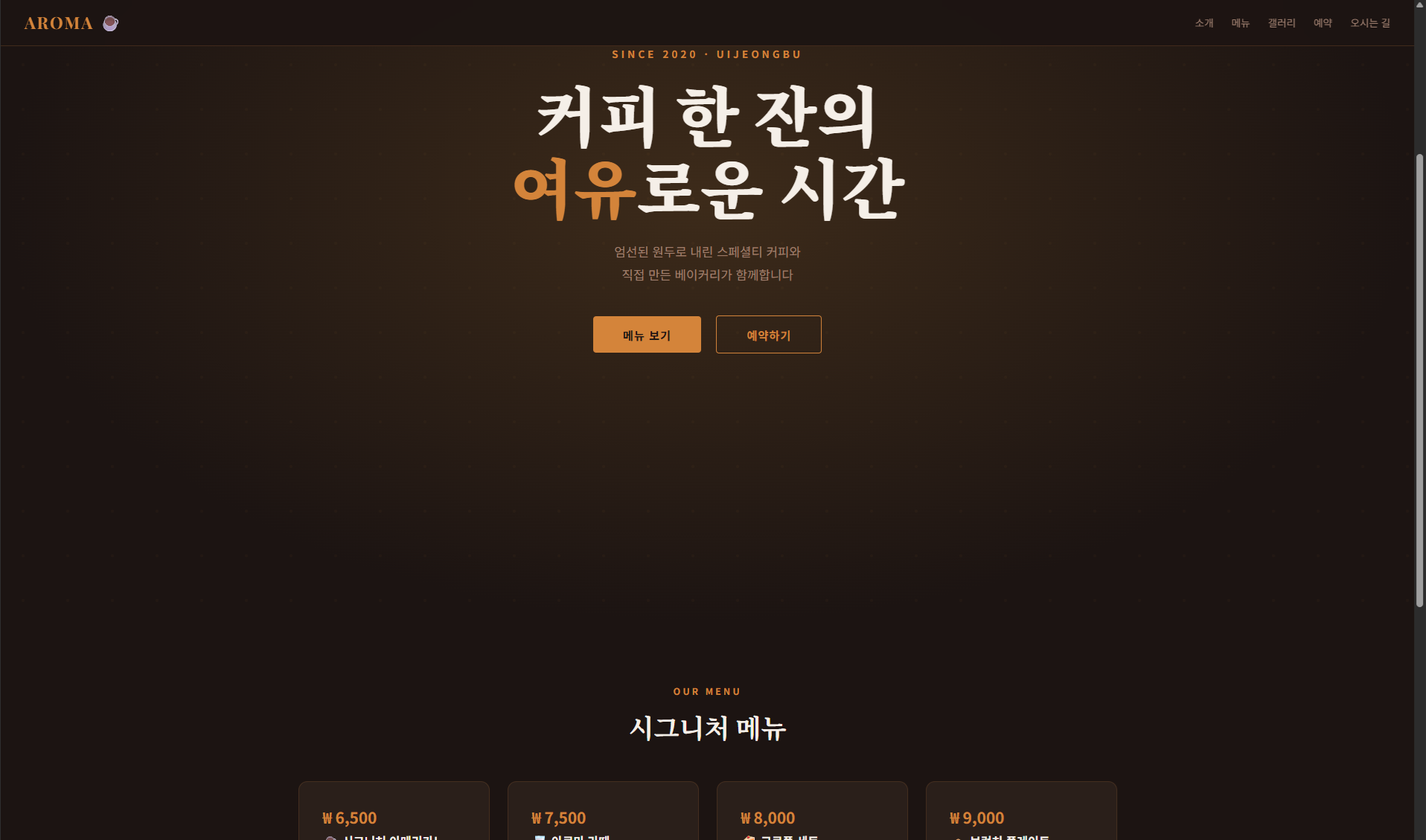 따뜻한 브라운톤의 카페·음식점 전용 디자인. 메뉴·예약·SNS 연동 형태.