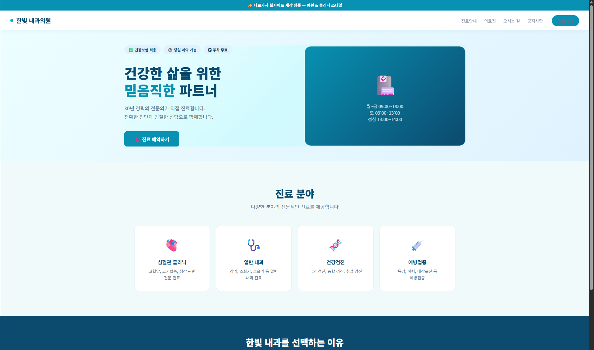 샘플 보기 →클린 민트+화이트 계열의 신뢰감 있는 의료기관 전용 디자인.