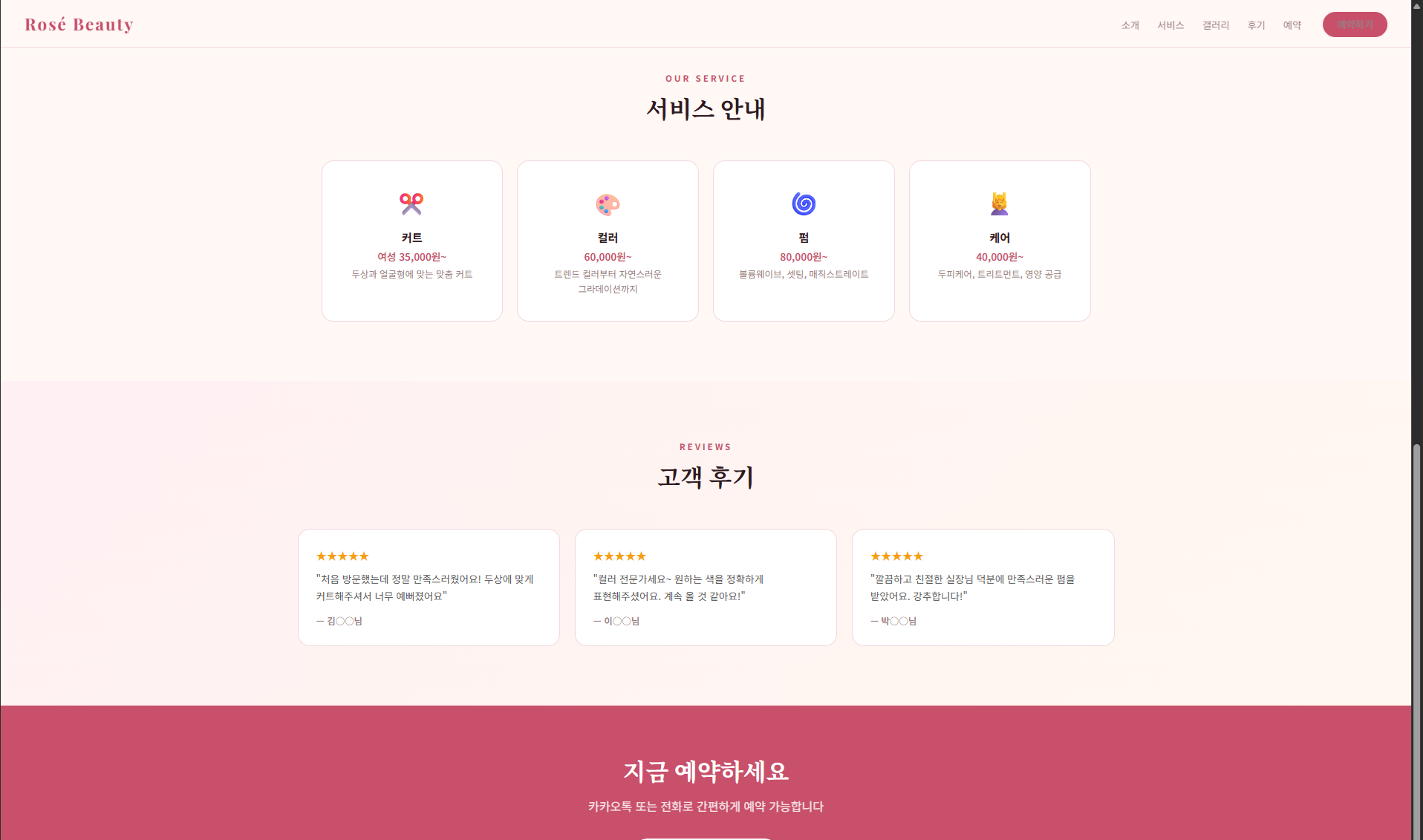 샘플 보기 →로즈핑크와 로즈골드의 세련된 뷰티 전문 디자인. 예약·메뉴·후기 포함.
